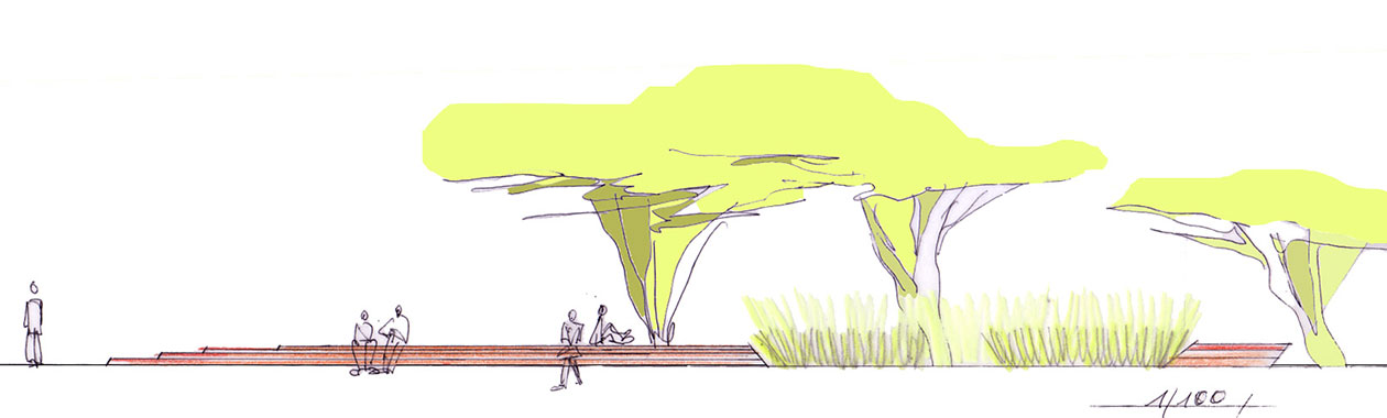 Für einen zentralen Bereich auf einem Hochschulcampus sind erste Skizzen entstanden, die dem Bedürfnis nach Aufenthalts- wie auch nach Rückzugsmöglichkeiten im Freiraum Gestalt geben. Die Pflanze spielt in verschiedenen Ausformungen eine wichtige Rolle zur Bildung von Raum, zur Teilhabe an Jahreszeiten und zur Verbesserung der kleinklimatischen Situation innerhalb der Innenstadt.